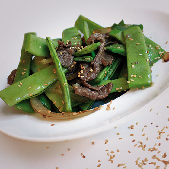 Rindfl eisch mit grünen Bohnen, Pfeffer und geröstetem Sesam